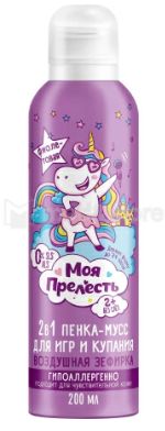 Мусс-пена разных цветов, имеет уникальную запатентованную мягкую и пластичную структуру, которая может принимать и сохранять различные формы и держать их. С цветной пенкой-муссом Моя Прелесть Ваш ребенок будет не только с радостью купаться, но и создавать художественные шедевры. Пенка-мусс бережно очищает, смягчает и увлажняет кожу. Тренирует мелкую моторику, развивает воображение у деток. Не тает на поверхности без воды, держит форму до 24 часов. Легко смывается водой, не оставляя следов. Яркие цвета и ароматы. Не содержит SLS, парабены. Гипоаллергенно. Предназначено для детей от 2 лет.